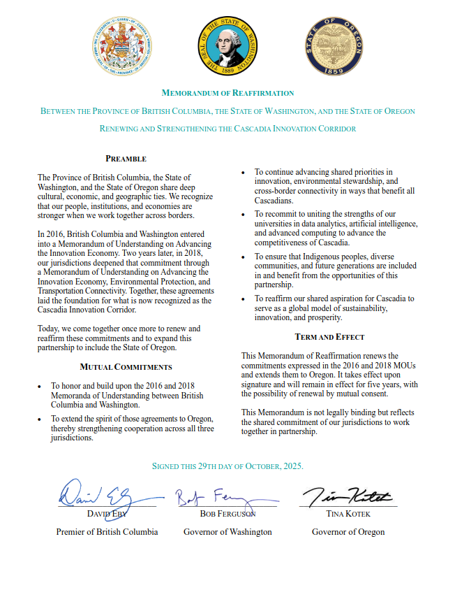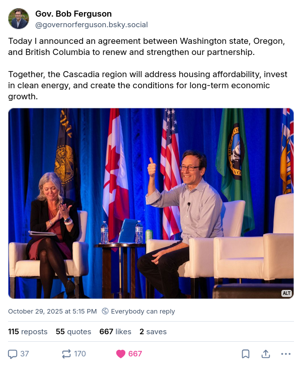 On Bluesky, Washington governor Bob Ferguson posted about the accord, and for the first time I can recall a major elected official in our region used the word "Cascadia":
