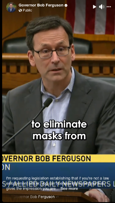Democrats didn't waste time holding hearing on one crucial bill: SB 5855, which would ban law enforcement officers from wearing facial coverings – including balaclavas, tactical masks, gaiters, and ski masks. The bill, introduced by Sen Javier Valdez (D-46, Seattle) is obviously directed at ICE goons, who refuse to identify themselves, kidnap without warrants, and feel free to use excessive force at their leisure. California enacted a similar law last year.