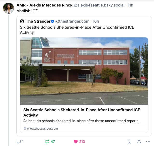 The Stranger reports that six Seattle public schools in the city's central and south end, including Cleveland STEM high school, went into shelter-in-place because of ICE activity in the vicinity. Response from area leaders was swift: