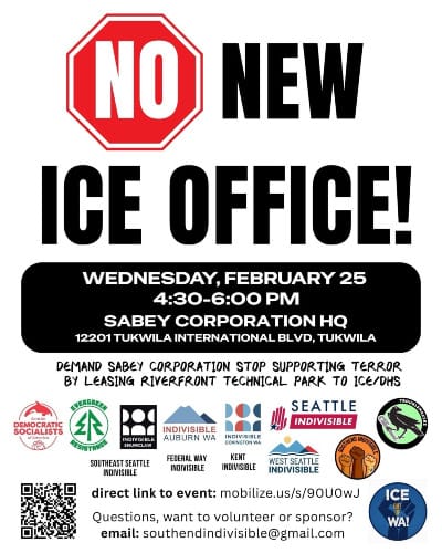 KUOW looks at efforts by cities in south King County including Burien and Renton, to ban new detention centers and jails – especially federal ICE facilities. KING-5 reports that the city council of Tukwila, which is located south of Seattle, voted yesterday 7-0 for a six-month ban on new detention facilities. There's concern that ICE is attempting to expand to a new facility in Tukwila owned by the Sabey corporation. In response, there's a protest at Sabey's headquarters tomorrow, Wed. Feb 25 from 4:30-6 pm at 12201 Tukwila International Blvd.