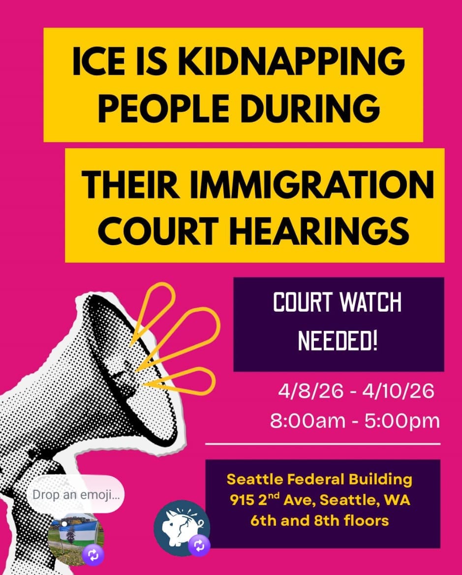 In related news, ICE has reportedly resumed kidnapping people at immigration hearings in Seattle, and Superfamilia KC has put out a call for court observers at the 6th & 8th floors of federal building in Seattle at 915 Second Ave. from 8 am - 5 pm April 8 - April 10.