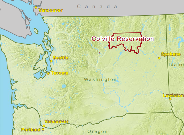The Confederated Tribes of the Colville Reservation is a tribal nation located in north central Washington state composed of 12 Indigenous bands, including the ščəl'ámxəxʷ (Chelan), sx̌ʷýʔłpx (Colville), šntiyátkʷəxʷ (Entiat), sʔukʷnaʔqín (Okanogan), šnp̍əšqʷáw̉šəxʷ (Wenatchi) and several others. These tribes historically extended across a wide swath of lands east of the Cascade range in what is now Washington, British Columbia, and Oregon.