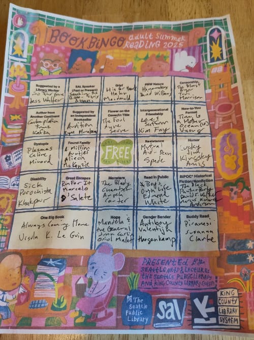 Each year, I play Seattle Public Library's Summer Book Bingo, trying to fill in spaces in all sorts of cool categories, which this year included Intergenerational Friendship, Monsters, and Gender Bender. This year, for the first time I got a full blackout, reading 24 books between Memorial Day and Labor Day. Yay! 📚