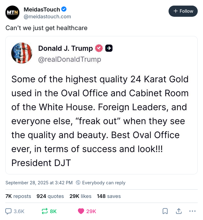 What would it mean to extend the federal shutdown and just eliminate the federal government altogether? Or at least become a more loose confederation like the European Union? Of course, Republicans, who use a lot of Big Words about smaller government won't go for that – because they want our tax dollars for their massive investments in masked secret police and detention centers, a nearly $1 trillion military budget, and a new ballroom and 24k gold decorations in Emperor Trump's White House.